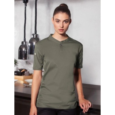 Moderna t-shirt da lavoro a maniche corte, traspirante e con regolazione dell'umidità , slim-fit, sciancrata in vita, colletto alto e abbottonatura corta, taschini con bottone, a filetto sul petto e sulla manica.