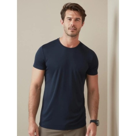 T-shirt maniche corte set-in, piccolo logo catarifrangente sul retro del collo, etichetta strappabile, struttura con cuciture laterali.