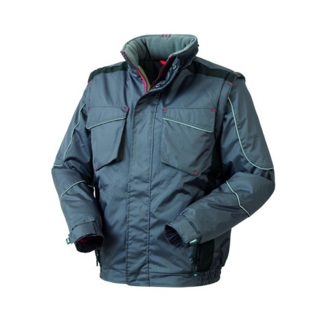 Giubbotto invernale imbottito con chiusura centrale anteriore con cerniera coperta da patella chiusa con bottoni automatici, cappuccio impermeabile interno chiuso con cerniera, maniche staccabili. Due tasche anteriori superiori applicate con soffietti laterali di rinforzo in tessuto rip-stop chiuse con patella e velcro, due tasche inferiori oblique chiuse con cerniera antipioggia. Cerniera orizzontale interna al fondo per la possibilità di personalizzazione sulla schiena, inserti di tessuto rifrangente, polsi al fondo manica con elastico e alamaro regolabile con velcro, elastico in vita, inserti di colore a contrasto.