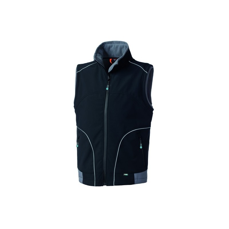 Gilet realizzato in tessuto Softshell a tre strati con chiusura centrale con zip waterproof, coulisse al fondo, profili rifrangenti anteriori e al fondo schiena. Un taschino interno al petto destro chiuso con zip, due tasche inferiori chiuse con zip waterproof e giromanica con inserto in maglia elastica e foro di aerazione su schiena. 8000 mm WP/2000 MVP.