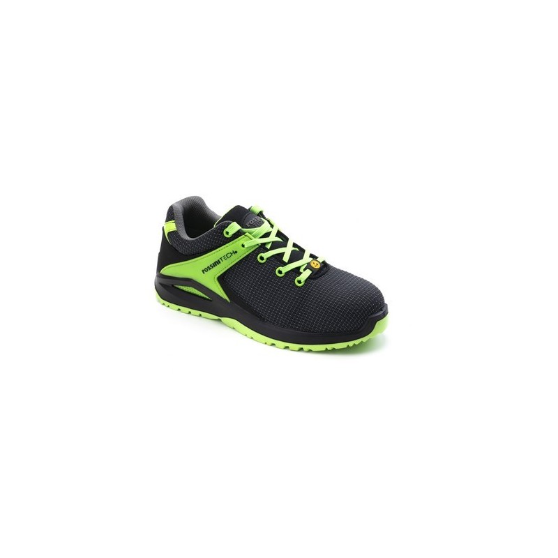 Calzatura bassa in esclusivo tessuto R-TECH alta tenacità di colore nero con applicazioni di colore verde fluo. Fodera interna R-DRY antiodore di colore grigio e verde fluo, linguetta imbottita, puntale in fibra di vetro, lamina non metallica, soletta anatomica, traforata, con gel antishock sul tallone che assorbe gli urti, estraibile, traspirante ed antistatica. Sistema R-FRESH che favorisce il ricircolo daria e mantiene il piede asciutto. Suola antiscivolo in poliuretano bidensità. CALZATURA METAL FREE Calzata 11 Mondo Point