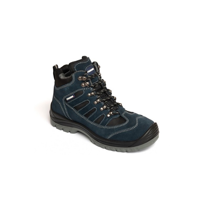 Calzatura alta in pelle scamosciata di colore blu con inserti in nylon e cuciture di colore a contrasto, fodera interna di colore grigio e nero, linguetta imbottita, puntale in composito, lamina non metallica, soletta anatomica, traforata, con tallone antishock, estraibile traspirante e antistatica. Suola in poliuretano bidensità.