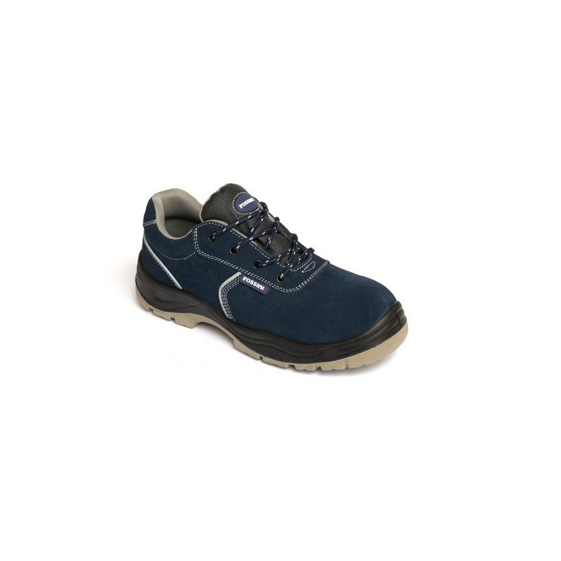 Calzatura bassa in pelle scamosciata forata di colore blu, puntale e lamina in acciaio, cuciture di colore grigio e inserti rifrangenti, soletta estraibile traspirante e antistatica, fodera interna di colore grigio, linguetta imbottita. Suola in poliuretano bidensità.