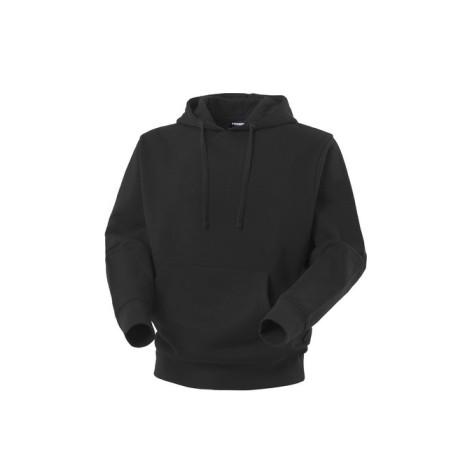 Felpa con parasudore interno al collo in tinta, cappuccio con coulisse, due tasconi inferiori, polsi e fascia girovita in maglia elastica.