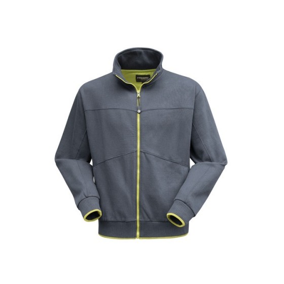 Felpa con collo alto con chiusura centrale con cerniera in plastica di colore a contrasto. Fascia parasudore e lunetta nella parte posteriore del collo di colore a contrasto, polsi e fascia girovita in maglia elastica con bordo di colore a contrasto. Esclusive cuciture a cavallo dei tagli a carré anteriore e posteriore, lungo le maniche e sullinserto obliquo davanti, due tasche anteriori a filetto.
