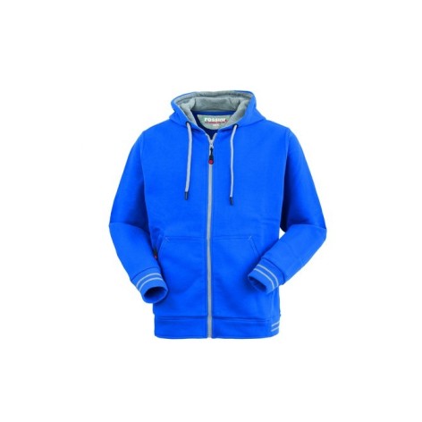 Felpa con chiusura centrale con cerniera in plastica, cappuccio chiuso con cordino, interno del cappuccio di colore a contrasto, parasudore interno al collo. Polsi e fascia in vita in maglia elastica con inserti di colore a contrasto e un taschino a filetto inferiore a destra chiuso con cerniera, due tasconi anteriori.