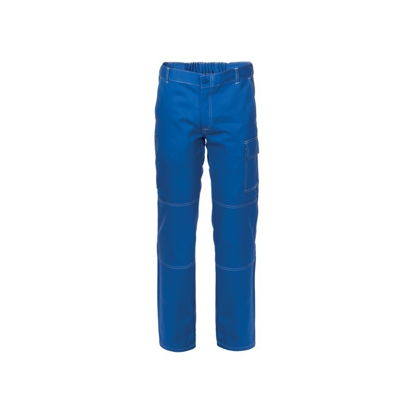 Pantalone da lavoro in cotone twill elasticizzato, con passanti in vita ed elastico posteriore, chiusura alla patta con cerniera e bottone scoperto, due tasche anteriori, una tasca posteriore applicata a destra chiusa con bottone, un porta metro applicato su gamba destra, un portapenne e un tascone laterale chiuso con aletta e velcro applicati sulla gamba sinistra, cuciture di colore a contrasto. ***4XL e 5XL solo per 01 blu e 12 grigio***