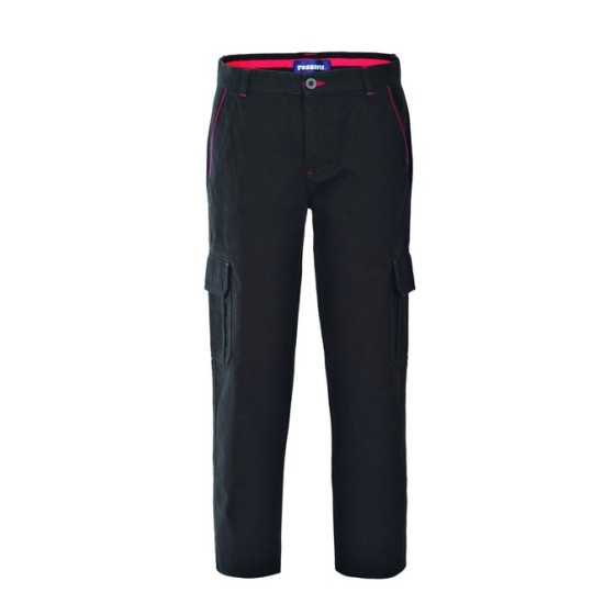 Pantalone da lavoro con elastico ai fianchi interno regolabile, chiusura alla patta con cerniera e bottone in cintura, travette varie di colore rosso. Due tasconi laterali con soffietto centrale chiusi con aletta e punti velcro, due tasche anteriori interne con cucitura di colore rosso, una tasca posteriore applicata a destra chiusa con aletta e punti velcro, una tasca posteriore applicata a sinistra chiusa con bottone tradizionale. *** TAGLIA 4XL DISPONIBILE SOLO PER IL COLORE 01 BLU ***