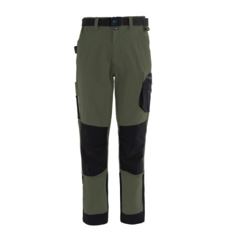 Pantalone da lavoro in tessuto stretch nelle quattro direzioni, ultraleggero e traspirante, elastici laterali in vita e passanti, inserto in rete di colore a contrasto nella zona renale. Chiusura alla patta con zip e bottone in metallo con finitura effetto rame. Pratica cintura estraibile in poliestere, regolabile con fibbia a chiusura automatica. Inserto in poliestere sul fianco destro ed anello di plastica inserito sul fianco sinistro utili per appendere accessori e strumenti. Due ampie tasche anteriori, tasca laterale porta metro applicata su gamba destra con ulteriore taschino in tessuto Ripstop, tascone laterale applicato sulla gamba sinistra chiuso con zip e con ulteriori due taschini, uno in tessuto Ripstop ed uno in mesh di poliestere. Due tasche posteriori, una a destra chiusa con aletta e velcro, una a sinistra chiusa con zip. Tessuto Ripstop sul fondo gamba con profilo rifrangente orizzontale inserito nella cucitura. Cavallo con doppio tessuto e tripla cucitura. Rinforzi di tessuto Ripstop di colore a contrasto sulle ginocchia. Travette a contrasto, pences alle ginocchia per maggior comfort.