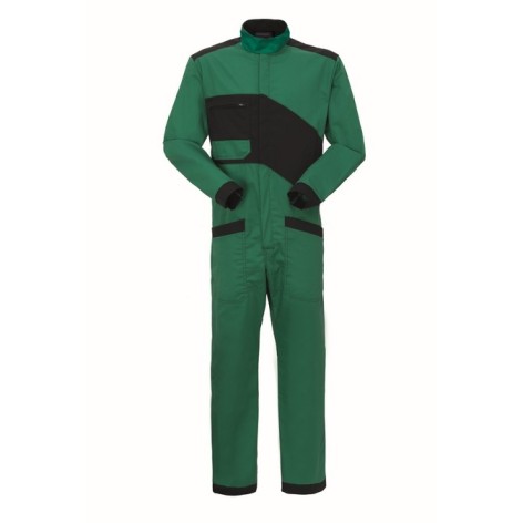 Tuta da lavoro con chiusura con cerniera centrale coperta, collo alla coreana chiuso con velcro. Un taschino applicato al petto destro chiuso con cerniera, due tasche inferiori applicate con profilo di colore a contrasto, elastico posteriore in vita, fondo manica dritto richiudibile con velcro. Profilo di colore a contrasto al fondo gamba e manica, inserto in tessuto di colore a contrasto sul petto e sulle spalle.