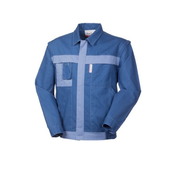 Giubbetto da lavoro con chiusura con cerniera centrale coperta, maniche staccabili con cerniera, polsino al fondo manica chiuso con velcro regolabile, cintura al giro vita con elastico ai fianchi. Due tasche applicate al petto di cui la destra con portapenne e porta telefono a soffietto, asola per il passaggio dellauricolare per il telefono, due tasconi applicati con apertura obliqua, strisce orizzontali anteriori e posteriori, patella copricerniera. Sotto collo e parte della cintura posteriore e anteriore in tessuto di colore a contrasto, cuciture con filo di colore in contrasto.