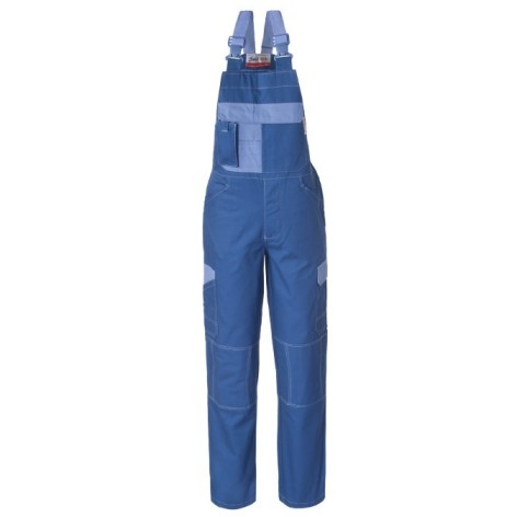 Pettorina da lavoro con chiusura anteriore della patta con bottoni coperti, apertura laterale chiusa con cerniera, tessuto salva reni posteriore. Un tascone applicato al petto con porta penne e porta telefono con soffietto chiuso con aletta e velcro, bretelle elasticizzate e fibbie in plastica, due tasche anteriori alla caretera, due tasche posteriori applicate chiuse con aletta e velcro, una tasca e un taschino metro applicati su gamba destra, un tascone applicato su gamba sinistra chiuso con aletta e velcro. Imbottitura alle ginocchia, rinforzo con doppio tessuto a tutte le tasche e relative alette di colore in contrasto, cuciture con filo di colore a contrasto.
