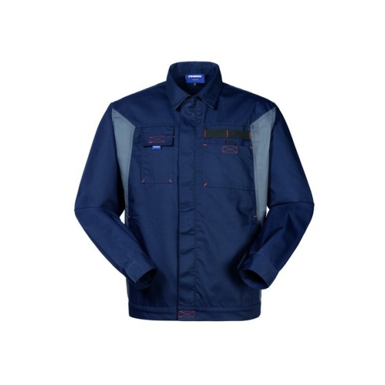 Giubbetto da lavoro con chiusura anteriore con cerniera coperta. Una tasca chiusa con velcro applicata al petto sinistro, un portacellulare chiuso con aletta e velcro applicato al petto destro, due tasche inferiori interne chiuse con velcro. Polsi chiusi con velcro, inserti e travette di colore a contrasto.