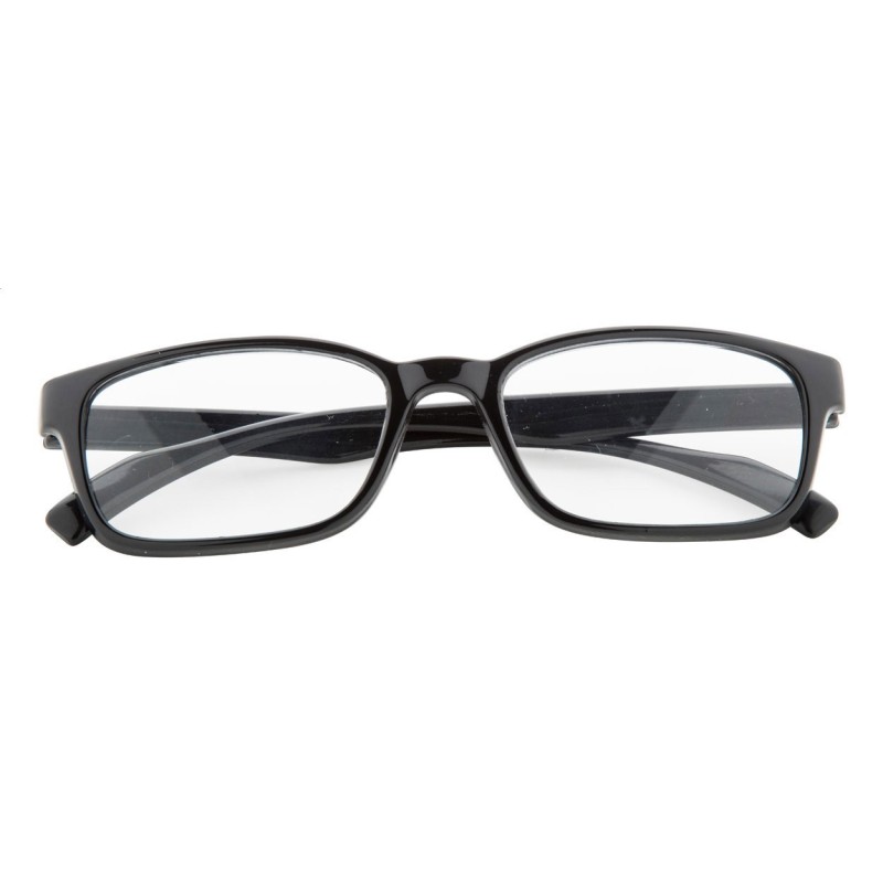 Occhiali da lettura in plastica con correzione +1,5 diottrie, con astuccio morbido.