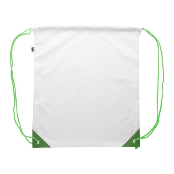 Sacca personalizzata con chiusura a coulisse, angoli rinforzati in pelle PU e cordini in tinta, in poliestere 190T RPET. Con grafica stampata in sublimazione su tutta la superficie ed etichetta RPET. MOQ: 25 pezzi.