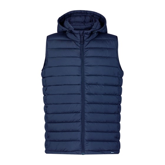 Gilet invernale in 100% poliestere RPET resistente all'acqua e al vento, con tasche laterali chiuse da cerniera, cappuccio regolabile ed etichetta RPET. Completo di sacchetto in poliestere RPET.