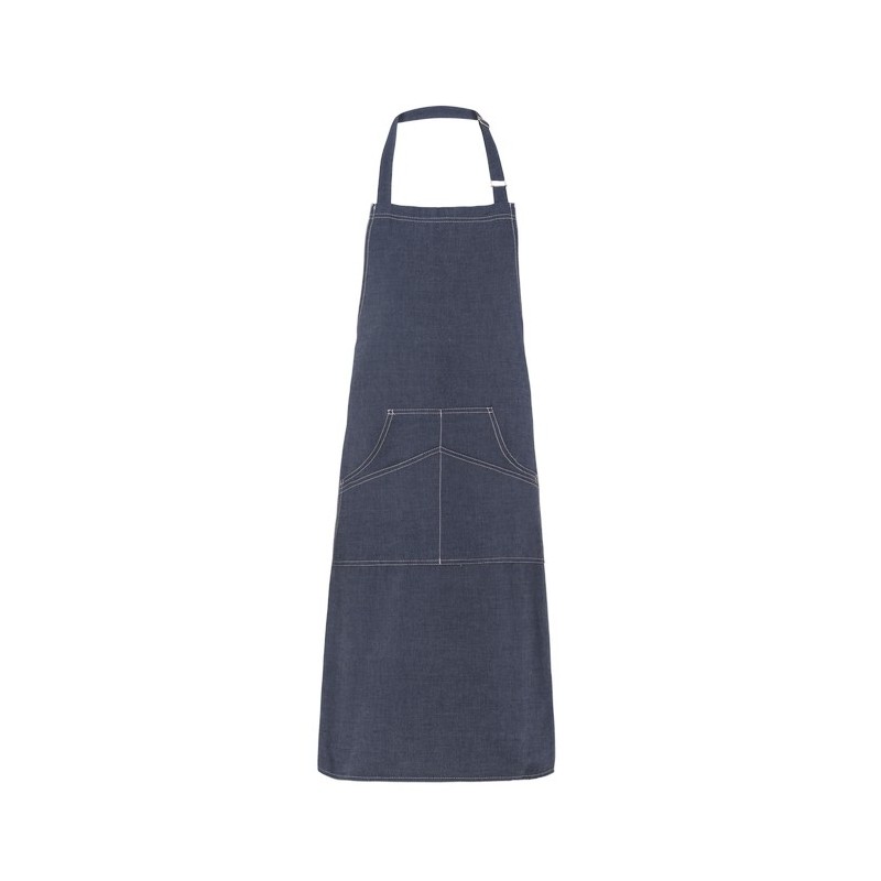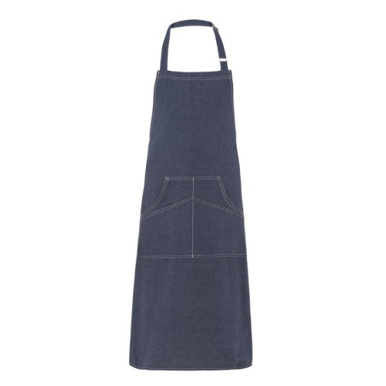 23P01H370 Chicago è un grembiule dallo stile grintoso ma elegante, ispirato al nostro storico modello Amsterdam e pensato per ambienti giovani e moderni, come pub e birrerie. In questa versione, è realizzato in pregiato jeans poli-cotone elasticizzato blu, resistente e di lunga durata. Chicago è un modello unisex con pettorina, caratterizzato da linee pulite ed essenziali e ribattuto con cuciture a due aghi in contrasto. Presenta un laccio del collo regolabile grazie ad una fibbia in galvanica ottone e una grande tasca centrale ancorata da rivetti in ottone anticato.